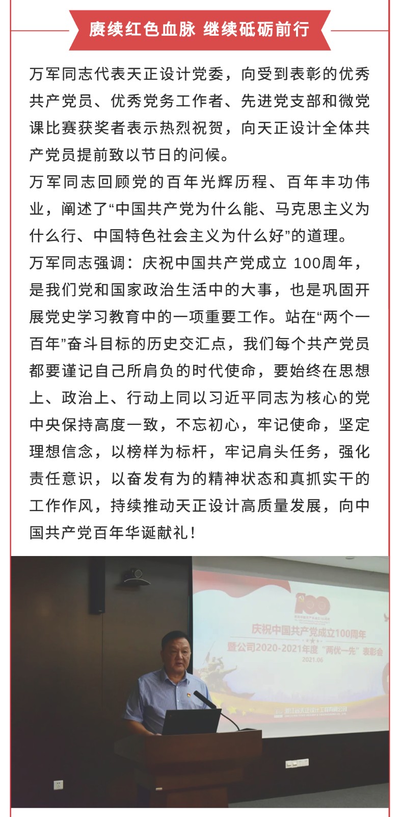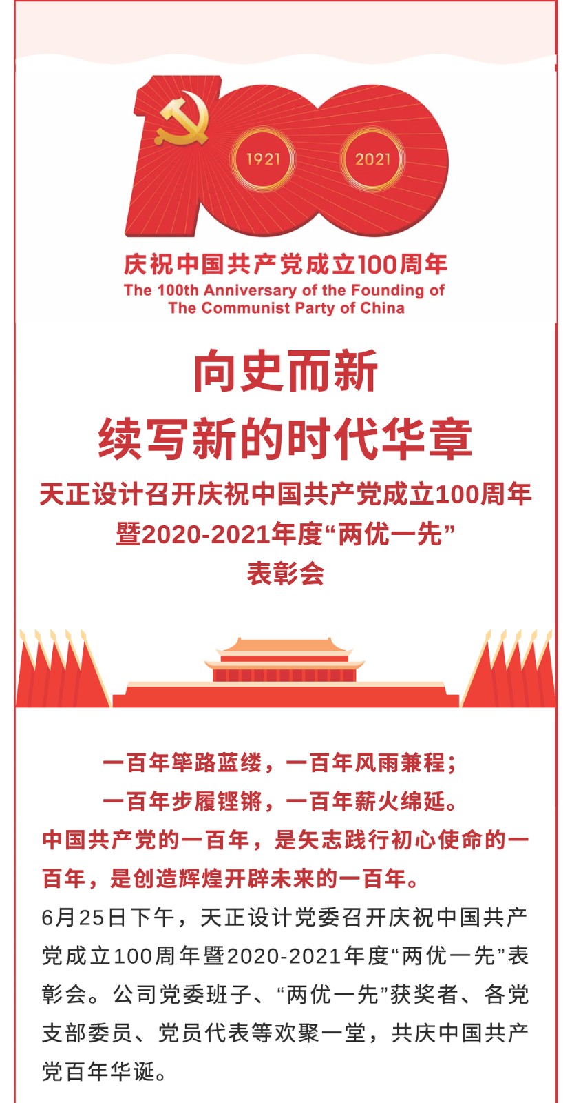 向史而新,续写新的时代华章——天正设计召开庆祝中国共产党成立100周年暨2020-2021年度“两优一先”表彰会